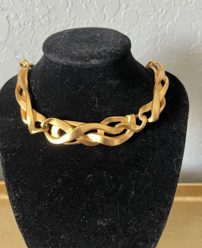 The Anne Kline Vintage Gold Tone Statement Chain Necklace is a stylish and eye-catching piece of fashion jewelry. This 16-inch necklace features a chain design with a vintage gold tone finish, making it a versatile accessory for any outfit. Signed by the brand Anne Kline, this statement necklace is perfect for adding a touch of elegance to any ensemble. Whether worn alone or layered with other necklaces, this piece is sure to make a statement and elevate your look. Barely worn! Been sitting in jewelry box for decades!