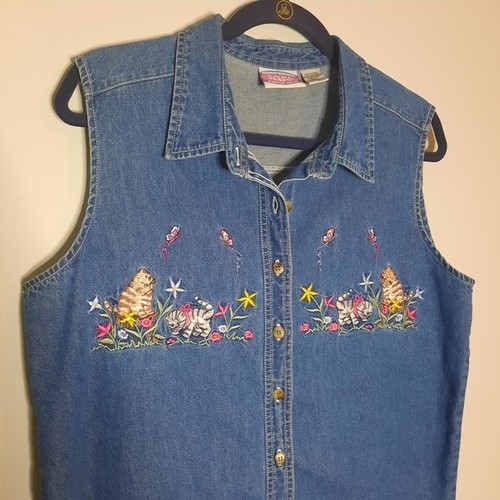Classic sleeveless denim tank with embroidered floral and cat details. Features a button-front closure and pointed collar for easy styling. The blue denim adds casual versatility for everyday wear. Pair with jeans or skirts for a relaxed, feminine look. Cottagecore, Grandma core, cats, spring