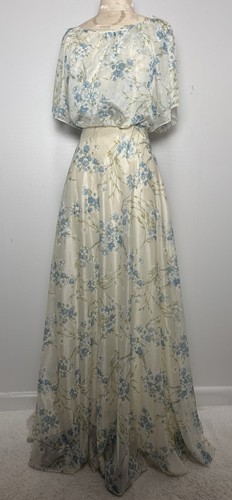 Made in the USA with ILGWU union label. • Style: Maxi dress, blouson bodice, full skirt. • Color: Ivory/Blue floral. • Underarm: 19”. Gently cleaned and ready to wear. • Length: 58”. • Waist: 13.5”.