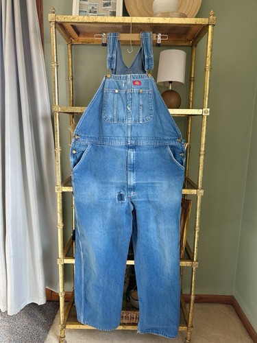 Vintage well loved Dickies overalls. They are from the early 2000s. They are a mid color wash, tagged mens 44 x 30. They have a few patches. One of the buckle loops is silver while the other is brass, it appears it was replaced. They are a solid pair of overalls!