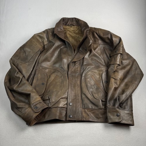 It features a full zip front with a snap-button storm flap, multiple utility pockets including a unique sleeve pocket, and an elasticized hem for a classic silhouette. Style: Bomber / Flight Jacket. Material: Real Leather.