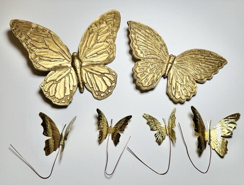 Set of 6 vintage brass/gold toned butterfly wall art from HOMCO and Home Interiors butterfly wired decor. • 2 larger HOMCO Home Interiors butterfly MCM wall decor. Plastic. Gold tone finish resembles metal. See photos for condition and measurements. • 4 Home Interiors butterflies. 2-2 in & 2-2 1/2 inch in size. Made of tin with beautiful brass tones. (lightweight with wire accents for “flying” display) Ready to hang. Perfect for mid-century, boho, or vintage décor. Condition: Good vintage condition with light patina from age. No major damage.