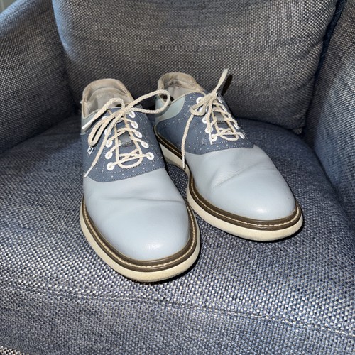 The Vintage FootJoy Two-Tone Saddle Golf Shoes are a classic pair of men's golf shoes in a blue and white leather design. With a low top shoe shaft style, lace-up closure, and spikeless feature, these athletic shoes are perfect for activewear occasions, specifically designed for golf performance. The FootJoy brand and logo accents add a touch of vintage charm to these stylish and functional golf shoes, making them a timeless choice for any golfer's wardrobe. These shoes are missing the inserts. But otherwise in excellent condition.
