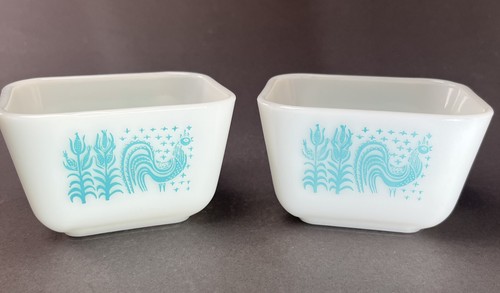 The Vintage Pyrex Amish Butterprint Refrigerator Dish 501 Set of 2 is a square-shaped glass dish with a capacity of 1.5 cups. It features a classic white and blue color scheme, perfect for adding a touch of retro charm to any kitchen. These dishes are oven and dishwasher safe, making them practical for everyday use. Made in the United States by PYREX, known for their quality bakeware, this set is a collectible piece that brings both functionality and nostalgia to your kitchen collection. Condition: these 501B Pyrex cups are an overall good condition. Except one has a slight chip on the edge of the rim. This will be photographed. The images on both of the cups are sharp. Please review photographs for complete condition of items.