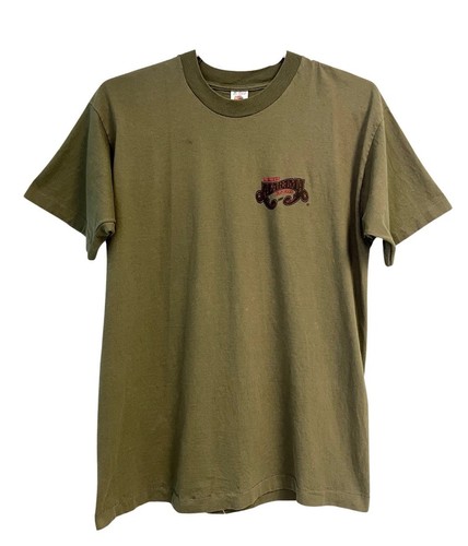Worn by those who rode shotgun in a ‘90s pickup, blaring “Dixieland Delight” under the stars. The faded red ink over olive cotton is a masterclass in understated nostalgia. The softness and structure of that 90s cotton is unbeatable — that real-deal, made-in-USA feel.