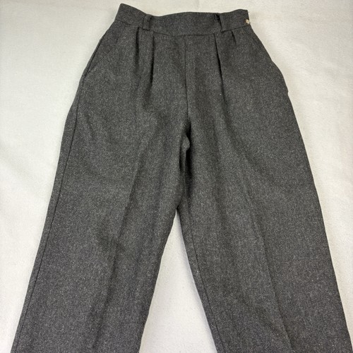The product is a pair of vintage Norton McNaughton women's trousers in size 10, featuring a high waist and pleated design. Made from 100% wool in a gray color, these pants have a button closure, tapered leg style, and an inseam of 29 inches. With a regular fit and retro appeal, these dress pants are a stylish addition to any woman's wardrobe, perfect for adding a touch of sophistication to any outfit. Made in the United States, these trousers showcase high-quality craftsmanship and timeless style.
