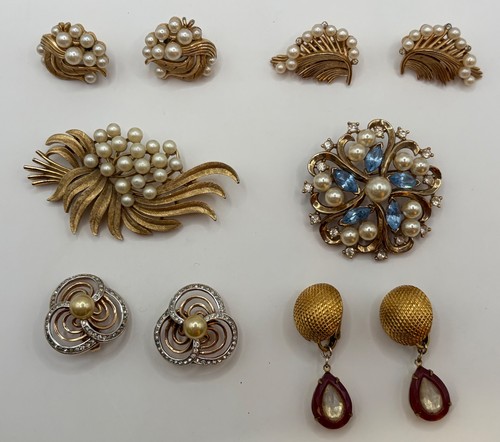 A higher-quality curated group with desirable signed pieces including a Pat Pend marked blue rhinestone brooch. Crown Trifari blue rhinestone / faux pearl brooch marked Pat Pend. Large Crown Trifari faux pearl spray brooch.