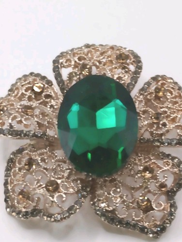 Vintage Flower Brooch/Pin Features A Large Central Oval-Shaped Faceted Vibrant Emerald Green Crystal , Securely Prong-Set Five-Petal Flower Is Intricate Openwork Filigree Accented with Tiny Amber Rhinestones For Subtle Sparkle A Classic Mid-Century Modern Statement Piece!
