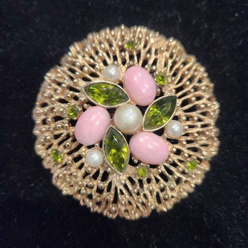 Vintage Sarah Coventry brooch FASHION SPLENDOR gold tone pink cabochon eggs and marquis emerald, green stones with faux pearls. Approx. 2.5" to 3" in diameter. Gold tone. *Slight wear noted around edges underneath on the pin side. Please see pictures for description.
