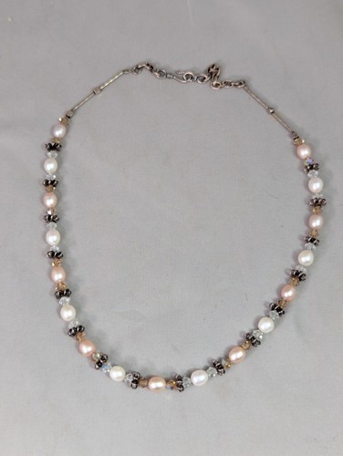 Silver beads, freshwater pearls, sparkly beads (one clear one pink), on a cable with a hook closure.