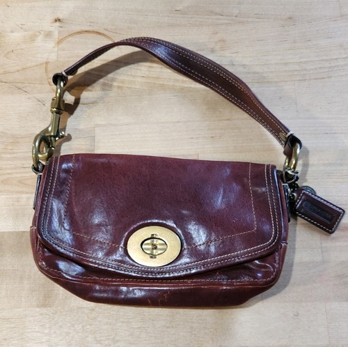 The COACH Legacy 65th Anniversary Brown Leather Handbag is a timeless piece perfect for any occasion, whether it be a casual day out or a formal event. Made in the USA, this vintage piece features a rectangular shape with a shoulder strap handle in brown leather. With a small size, this handbag is lined and comes with inner and outer pockets for organization. The gold hardware accents add a touch of elegance to the classic design. While missing a part, this limited edition handbag is a must-have for any fashion-forward woman looking for a stylish and sustainable accessory.