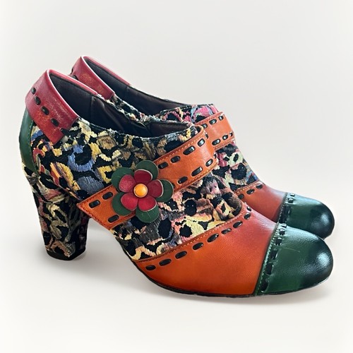 Vintage Style Colorful Floral Mary Jane Heels Chunky Heel Retro Boho EU 38 whimsical Art Teacher Description: Unique and eye-catching Mary Jane heels featuring a bold multicolor floral fabric with contrasting orange and green leather accents. Chunky heel design with strap and decorative flower detail for a fun retro boho look. Side zipper closure for easy wear. Pre-owned condition with noticeable wear along the top edges and fabric fraying near openings (see photos). Soles show light wear. Still a standout statement pair. Style Tags: boho retro statement colorful floral mary jane chunky heel eclectic art teacher whimsical vintage style