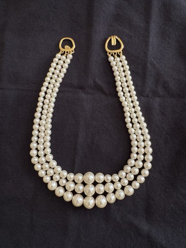 A statement piece featuring three strands of cream-colored faux pearls. A decorative, large gold-tone toggle clasp with an organic, textured shape. Includes an oval metal hangtag clearly stamped with "LIMITED". Retro/vintage costume jewelry, likely dating from the 1980s or 1990s, when The Limited produced a wide range of popular accessories.