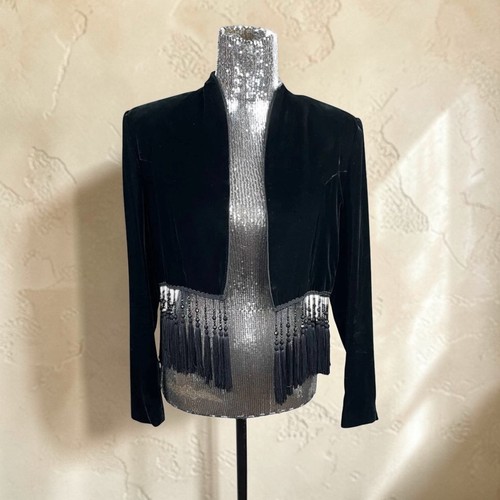 Vintage 80s Whimsigoth Velvet Cropped Fringe Tassel Evening Jacket Small Travel Style: Goth, Victorian Gothic, Dark Academia, Glam, Eveningwear Measurements: • Shoulder to shoulder: 17 inches (laid flat) • Pit to Pit: 16.5 inches • Sleeve length: 23.25 inches • Length: 21 inches (All measurements are approximate.) Size Note: Tagged as size 6 - fits closer to Small. Measurements are provided; vintage tags may not match modern sizing. Please compare before purchase. Material: 70% Acetate, 30% Rayon Condition: Pre-owned - Good - Velvet Nap Abrasion On Back (SEE PHOTOS) Please review photos and measurements carefully before purchasing.