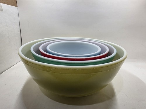 Vintage Pyrex Primary Colors Nesting Mixing Bowls Set of 4. Condition is Used. Shipped with USPS Ground Advantage.