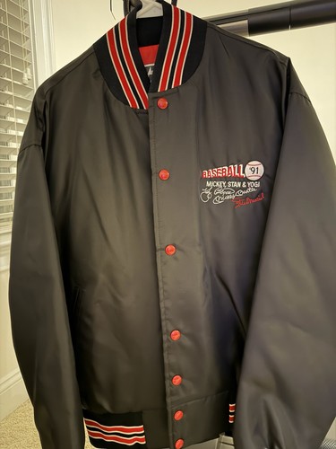 This Vintage Satin Letterman Jacket from the 90s is a stylish and unique addition to any man's collection. Made with high-quality satin material and featuring a stand-up collar and button accents, this jacket exudes a classic 90s vibe. With a size L, it offers a regular fit for a comfortable and flattering look. Perfect for casual occasions in the winter, fall, or spring, this jacket also includes pockets for added functionality. Handmade with care and attention to detail, this jacket is a timeless piece that is sure to make a statement. Trump plaza and casino, Yogi Berra, Mickey mantle and Stan Musial on the chest. RARE!!!
