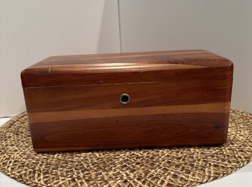 The Vintage Lane Furniture Sales Sample Mini Wood Chest is a charming 9-inch jewelry trinket box made of cedar with a traditional wood-finished design. This rectangular box is suitable for all occasions and features a lid, making it perfect for storage and display in any room. With a medium size and a classic wood grain pattern in a brown color, this unique piece from the MCM era is a nostalgic collectible that adds character to any space. The chest does have a few scratches, see pictures. Measurements are included in the pictures. There is no key with this. Presented by Spiegal Furniture Store.