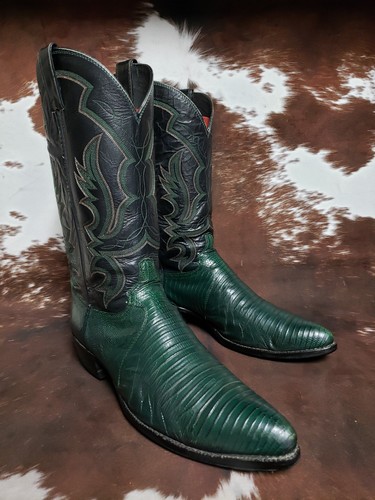 The Justin Vintage Green Leather Teju Lizard Western Cowboy Boots in men's size 11.5D are a stylish and classic choice for those looking to add a touch of rugged Western flair to their wardrobe. Made by the reputable brand Justin Boots, these boots feature a unique lizard character design on the green leather upper. The leather outsole and shoe width provide comfort and durability, making them ideal for everyday wear or special occasions. These cowboy boots are a timeless piece that showcase both quality craftsmanship and a nod to the traditional Western style.
