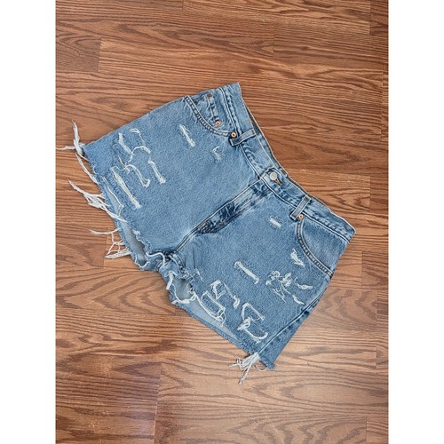 Vintage Levi's 517 high-waisted denim shorts in a classic medium wash. These custom cut-off shorts feature a heavily distressed aesthetic with frayed hems and shredded detailing throughout the front. Constructed from 100% cotton non-stretch denim, they offer a relaxed fit originally derived from the bootcut silhouette. Finished with a traditional five-pocket design, signature red tab, and a button fly. 2 Measurements: • Waist: 16" (32" doubled) • Rise: 11.5" • Inseam: 3"