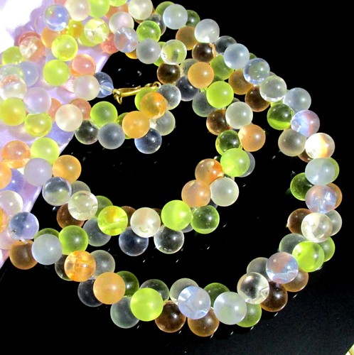 This is the popular "Wisteria" lucite bubble necklace by Monet, in excellent condition and wearing the signature metal hang tag...It is a sweeping 34" long and has a pleasing weighty feel (167 grams)~~a whimsical beauty with clustered pastel ("fruit salad") clear and frosted beads...It offers an appealing moonglow translucence, and an exclusive elegance that incorporates a playful persona~~Irresistible! Thanks for viewing, any questions are very welcome...