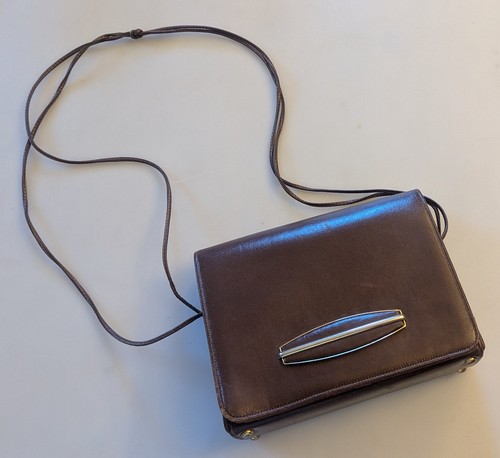 Made in the USA. There is an interior pocket for a mirror and 4 brass foot pads on the bottom. Material: Genuine Leather. Normal signs of age.