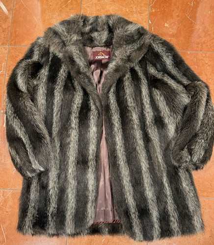 BLACK AND GREY STRIPED FAUX FUR. MID WAIST COAT. SINGLE HOOK CLOSURE IN FRONT. SIDE SLOT POCKETS.
