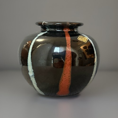 Made in Japan in the late 20th century, this ceramic vase showcases abstract art with a multicolor finish.