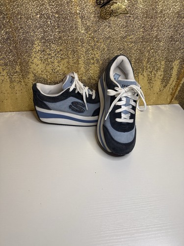 These Vintage Skechers 90s Blue Bedazzled Women's Platform Sneakers in size 8.5 offer a retro Y2K vibe with a stylish blue color and embellishments. The lace-up closure, low-top design, and rubber outsole provide comfort and support for casual wear. The Skechers brand is known for its athletic shoes, making these sneakers perfect for walking and everyday activities. The faux suede upper material and fabric lining add a touch of durability and style to this solid blue sneaker with logo accents, making it a versatile choice for the summer, fall, and spring seasons.