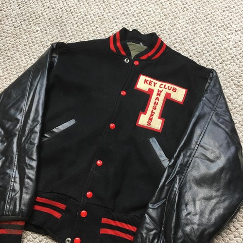 Fantastic details on this one. Best ive ever seen. Brand/Subject: Vintage Key Club Wranglers varsity letterman jacket. Style: Short-length varsity letterman jacket with snap-front closure and leather sleeves. Color/Material: Black wool body with black leather sleeves, red striped knit collar, cuffs and waistband, and a green polyester lining. Gender/Size: Mens size 42 regular fit as indicated on the interior size tab.