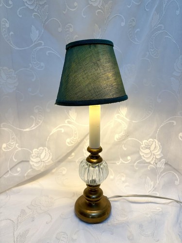 Vintage Brass Blown Glass Candlestick Table Lamp 13.5” This vintage table lamp will add warmth to any room Brass has some patina and that contrasts with blown glass piece Bottom is 3” diameter This takes a candelabra bulb and clip on shade Total height with the shade on is approximately 14” Comes with the green shade Shown in pictures with different clip on shade options, easy to change the feel with a simple clip on shade options Bulb is not included Last picture shows patina on the bottom Please check pictures