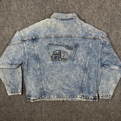 Vintage Tyca USA Denim Jacket Mens XL Acid Wash, embossed semi and USA design. In great condition, does have some staining as shown in photos.