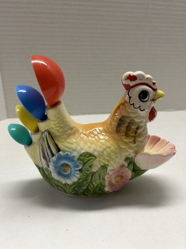 Chicken has very small chips in the rim of the front flower as shown in a picture. There are 4 measuring spoons in the tail of the chicken. Some paint is worn off from the chickens comb. Other than that - this little cutie is ready for display (or use!) in your vintage kitchen!