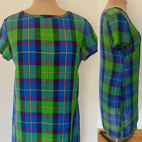 It is a bright, lightweight, unlined plaid with a very slight A-line silhouette and bust darts. It's perfect for career or casual wear! This dress will need to be cleaned and pressed before enjoying it.