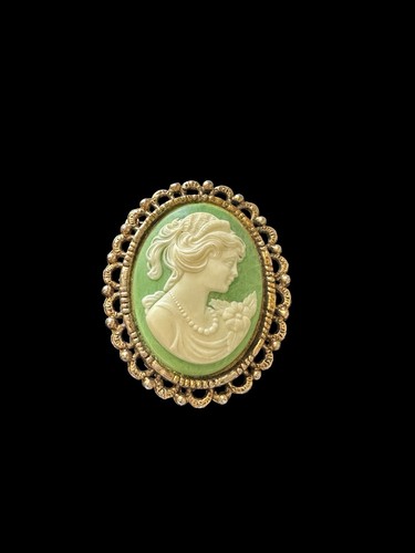 The Cameo Lady Vintage Brooch Pin in Mint Green and Ivory with Antique Gold Tone Detail is a beautiful addition to any woman's jewelry collection. This oval-shaped brooch exudes a vintage charm, perfect for a birthday occasion or as a lovely accessory for any outfit. With its intricate antique gold tone detailing, this brooch captures the essence of beauty and elegance with a touch of nostalgia. A versatile piece that can be worn on clothing or bags to add a touch of sophistication to any ensemble.