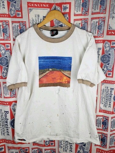 See photos for stains and holes. Someone truly put this shirt to use but still has life and a lot of stories to tell. Pit to pit 24" Top to bottom 29"