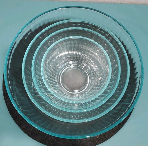 The product is a set of vintage Pyrex ribbed nesting bowls in clear aqua tint. Made of glass, these round bowls are perfect for all occasions and feature the iconic Pyrex brand. With a ribbed pattern and a retro design from the late 20th century, these nesting bowls are a charming addition to any kitchen or dining room. The impressive originality of these bowls makes them a valuable piece for collectors or those looking to add a touch of vintage flair to their home decor. Please refer to pictures for condition. These are used vintage no cracks. Estate find