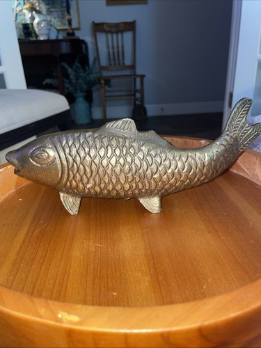 This vintage solid brass Koi fish figurine sculpture exudes a Mid-Century Modern style with its sleek design and artistic flair. The original piece showcases intricate details and craftsmanship, making it a unique addition to any decor collection. Measuring 10 inches in width and 3.5 inches in height, this American-made brass sculpture adds a touch of nostalgia and sophistication to any space. Perfect for collectors of antique furniture or those looking to elevate their home with a touch of retro charm.