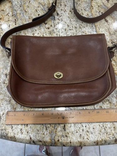 The Vtg COACH Brown Leather TURNLOCK CITY BAG Crossbody Purse in British Tan is a stylish and practical accessory for women. Made of high-quality leather with a matte finish, this medium-sized rectangular bag features a turn lock closure and a gold hardware. The adjustable crossbody strap in brown leather adds versatility to the purse, making it suitable for everyday use. The vintage design with a city theme and solid pattern adds a classic touch to the overall look. Perfect for carrying essentials while on the go, this Coach bag is a timeless piece crafted in the United States.