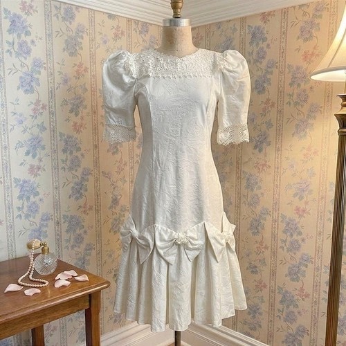 Romantic 80s aesthetic with its intricate lace collar and puff sleeves. This drop-waist silhouette features charming oversized bow accents at the hip and delicate lace trim along the sleeve cuffs. Sleeve: Puff Short Sleeve with Lace Trim.