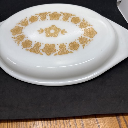 The Vintage Pyrex Butterfly Gold Divided Casserole Baking Dish 1 Quart 063 with Lid is a stylish and versatile piece of decorative cookware. With its classic round shape and striking gold color, it exudes a mid-century modern aesthetic. The dish features a beautiful butterfly theme, making it a charming addition to any kitchen or dining table. Made of durable ceramic, this covered dish is both functional and visually appealing, perfect for serving and storing a variety of dishes with its single compartment. An impressed backstamp ensures its authenticity, making it a sought-after collector's item.
