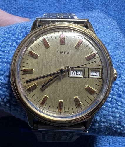 1976 timex , 2 tone bracelet, running but unsure of accuracy, seems to be keeping good time but may need service at some point. This vintage men's gold tone Timex mechanical day/date wristwatch from the 1970s features a classic round shape with a gold stainless steel case and bracelet band. The watch has a mechanical (manual) movement with a day/date feature and seconds hand, making it a practical and stylish accessory for casual everyday wear. With a 34.5mm case size and ivory dial color, this vintage Timex wristwatch is a timeless piece with a touch of nostalgia, perfect for watch enthusiasts looking for a unique addition to their collection.