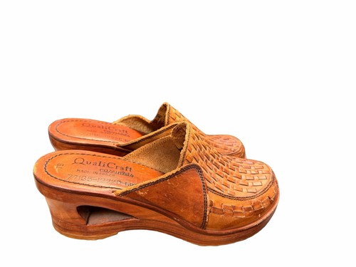 These retro clogs were made in Brazil for QualiCraft Casualets and are crafted from high-quality brown leather and wood. They feature a 1970s "hippy" or "boho" style with a woven basket-weave upper and wood-look heels.