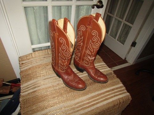 The VTG Tony Lama Gold Label Tall Brown Exotic Round Toe Cowgirl Boots are a vintage pair of Western-style boots designed for women in US size 5.5 (UK size 3.5). These knee-high boots feature a classic round toe shape, low block heel, and comfortable leather insole and lining. The boots are adorned with embroidered accents and a solid brown color, making them perfect for casual occasions in any season. Made by the renowned brand Tony Lama, these boots are a timeless addition to any cowgirl's wardrobe, embodying both style and comfort in their design.