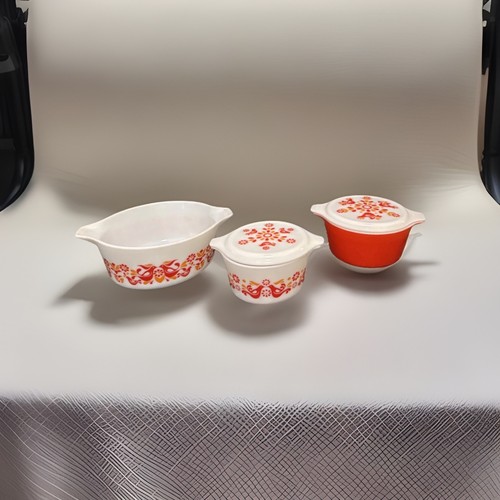 This 1971 classic features the iconic red and orange bird and floral motif on crisp white milk glass and solid red. • Lids: Both opal decorated lids are in collector-quality condition with crisp patterns and smooth edges.