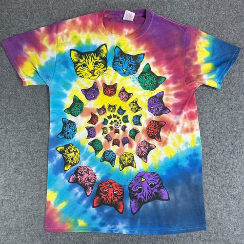 Vintage Tie Dye Psychedelic Spiral Cat T-Shirt Small Rainbow Multicolor Y2K In Good, Pre-owned Condition. Please refer to photos for condition & measurements. Approx. measurements: Pit to Pit: 17" Top to Bottom: 25" A must-have for cat lovers and tie-dye collectors alike. If you have additional questions, concerns, or offers, don't hesitate to message me. Thank you for looking and have a great day!