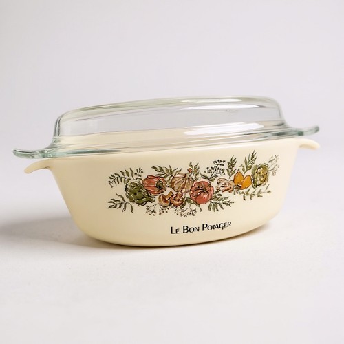 The creamy white pyroceram base is adorned with a vibrant illustration of garden-fresh artichokes, peppers, mushrooms, and garlic, making it as beautiful for serving as it is for cooking. Paired with its original clear glass lid, this durable piece is perfect for baking family favorites or displaying as part of a retro kitchen collection.