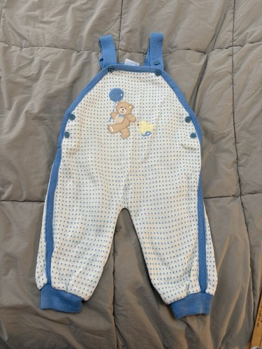 This Vintage Macys Baby Boy One Piece Romper Overalls in size 6-9 months features a polka dot pattern with a sleeveless design, perfect for a casual or activewear occasion. Made from acrylic knit fabric, the romper showcases an embroidered blue bear character, adding a touch of charm to the retro 80s and 90s theme. With a button closure and comfortable fit, this one-piece outfit is ideal for any season and is a must-have addition to any baby boy's wardrobe.