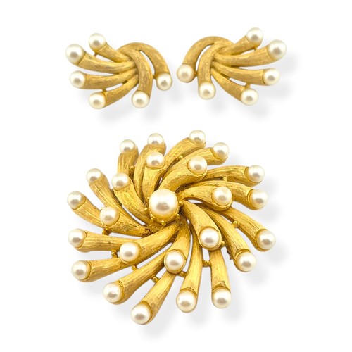 This stunning mid-century modern (MCM) demi-parure by Crown Trifari features a sophisticated "Starburst" or "Atomic Swirl" design. Signature: All pieces are signed on the reverse with the iconic Trifari © mark (the 'T' topped with a crown).