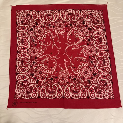 The product is a set of vintage red cotton paisley bandanas, made in the USA with the brand RN 16429. These original bandanas feature a classic paisley pattern in a vibrant red color, perfect for a Western style look. Made of cotton and suitable for adult unisex wear, these bandanas offer a touch of retro charm to any outfit. Originating from the United States, these bandanas are a unique and stylish addition to any vintage collection.