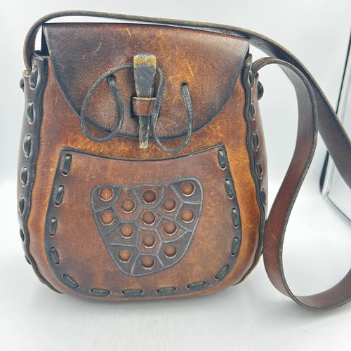 Vintage handmade leather crossbody bag with rich natural patina and artisan folk styling. Constructed from thick leather with hand-laced edges, decorative punched leather appliqué, and a hand-carved wood toggle closure. Features an adjustable leather shoulder strap and a compact, functional size. The bag measures approximately 10 inches tall and has a structured yet soft feel from age and use. Condition: Pre-owned vintage condition with visible wear throughout. Leather shows scuffing, darkening, and age-related cracking on the strap, consistent with long-term use. All lacing and the wooden toggle are intact. Please review photos closely for condition details. A unique, character-rich vintage bag with authentic handmade appeal.